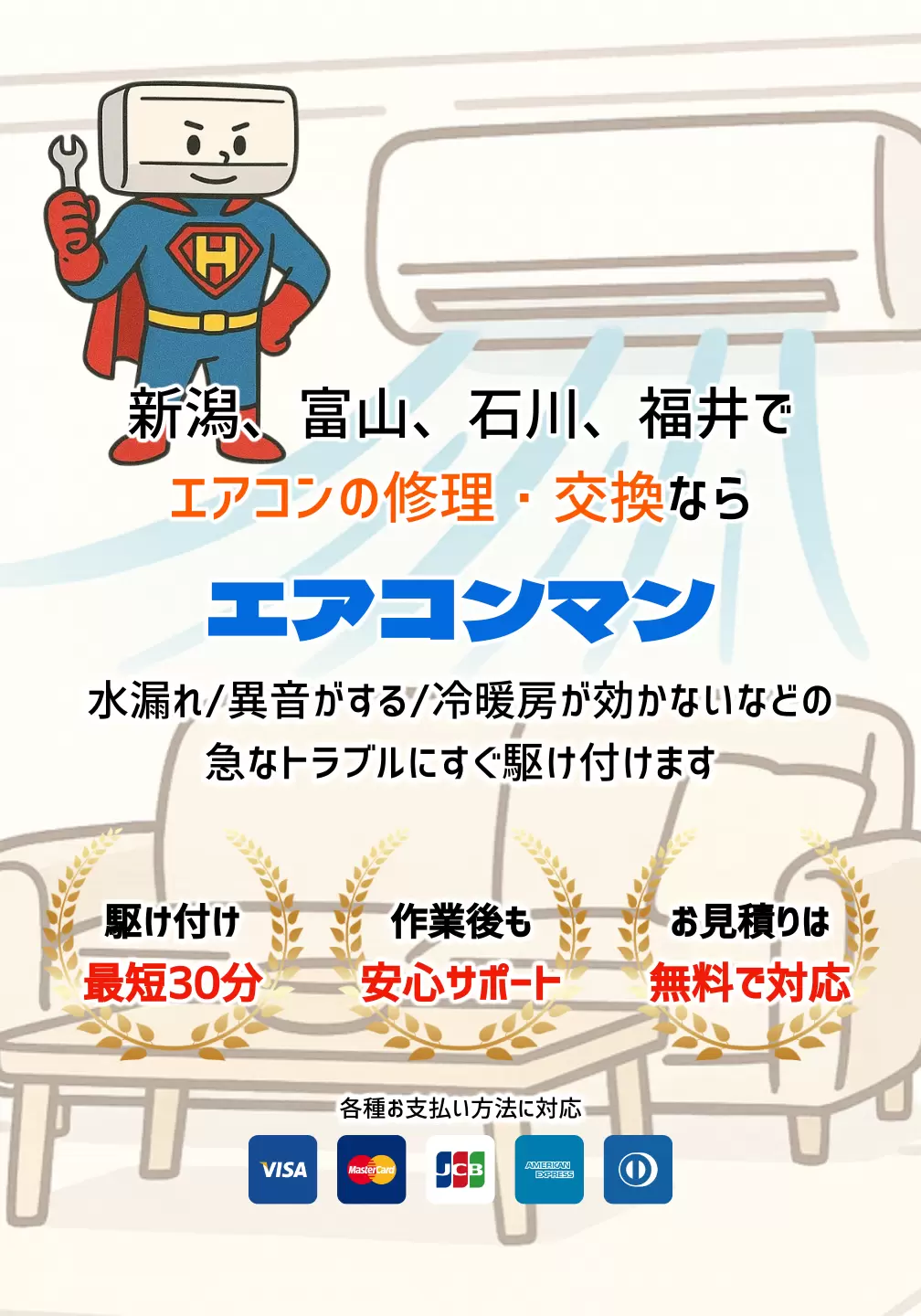 「エアコンが効かない」「電気代が高い」「急に動かなくなった」そんなお悩み、エアコンマンにおまかせください!私たちは北陸全域に対応したエアコンのプロ集団です。取付・交換・修理まで、365日スピード対応します。最短即日訪問、適正価格&プロの技術力で安心のサービスをお届けします。